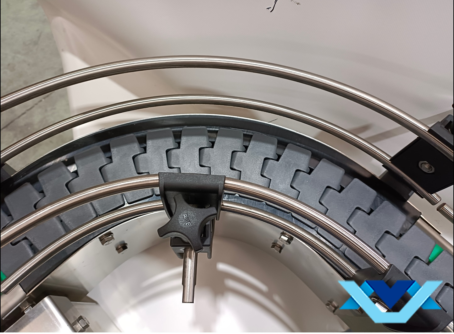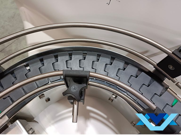 Este sistema de alimentación de tapones por arrastre permite colocar el contenedor fuera de la zona de embotellado. Contenedor y estructura, construidos totalmente en acero inoxidable.