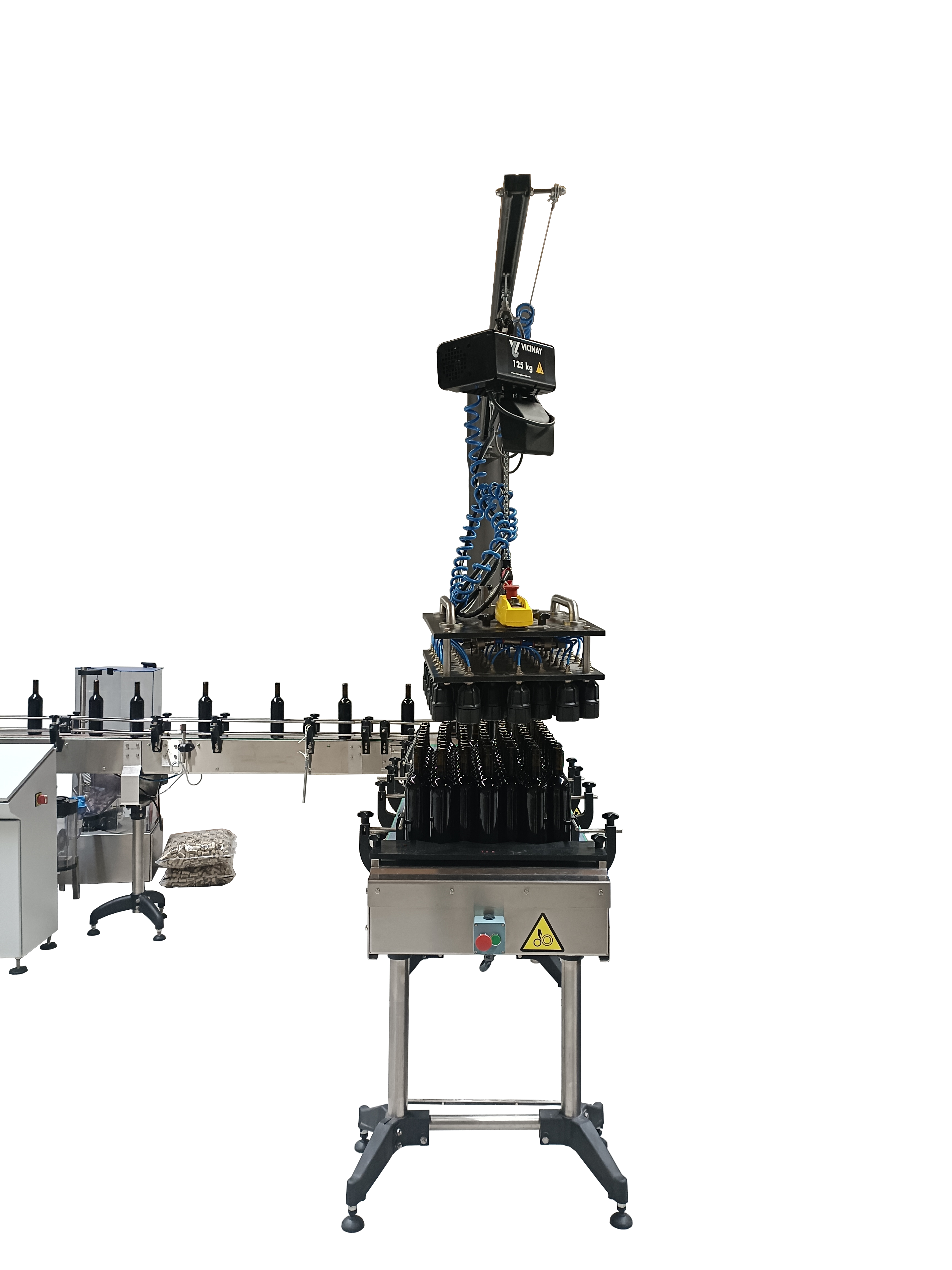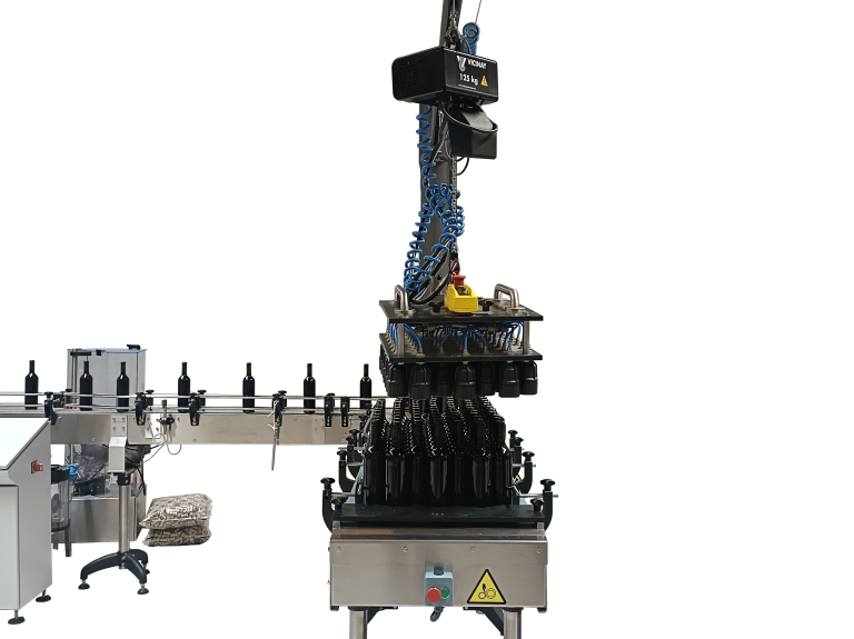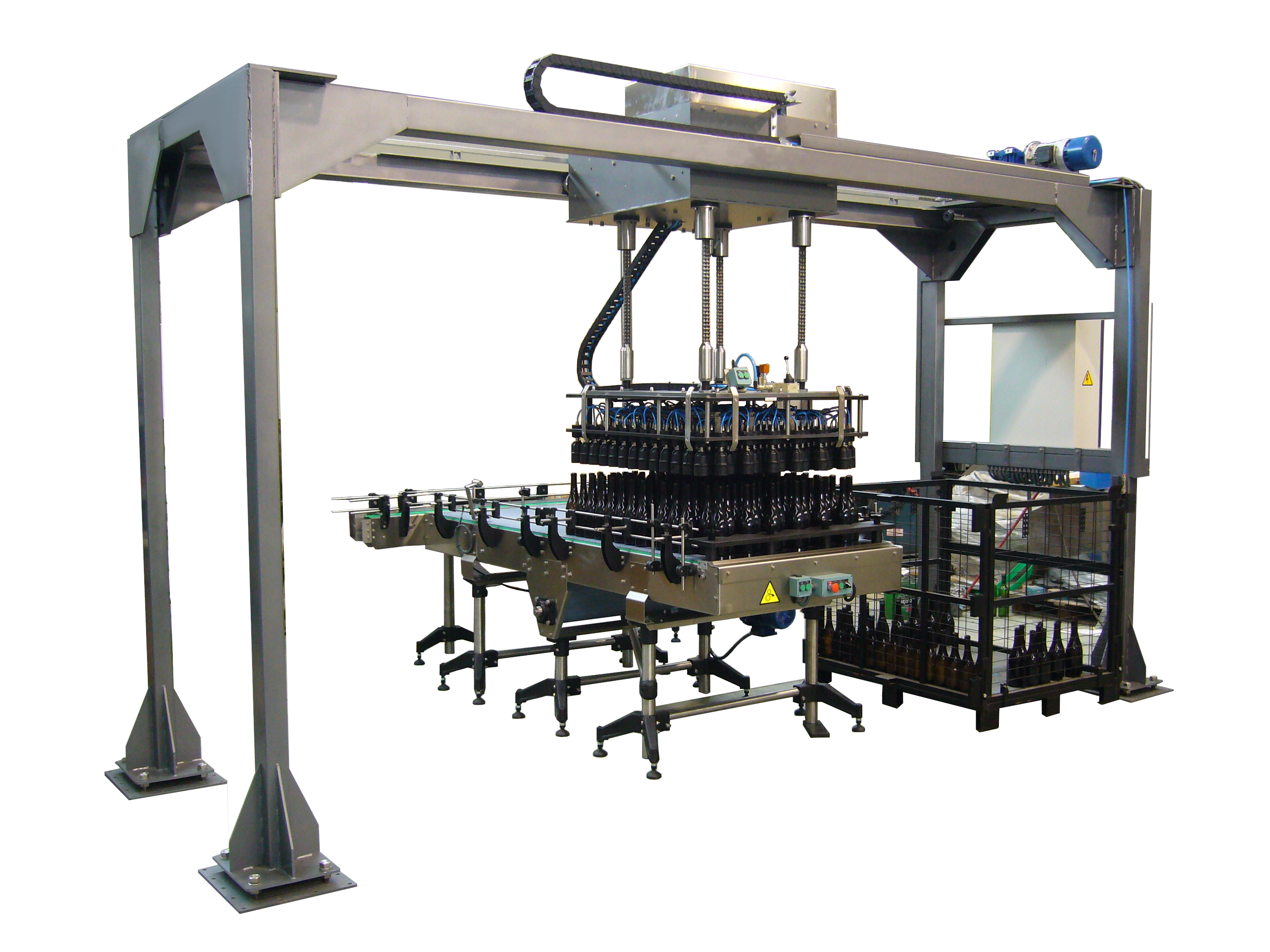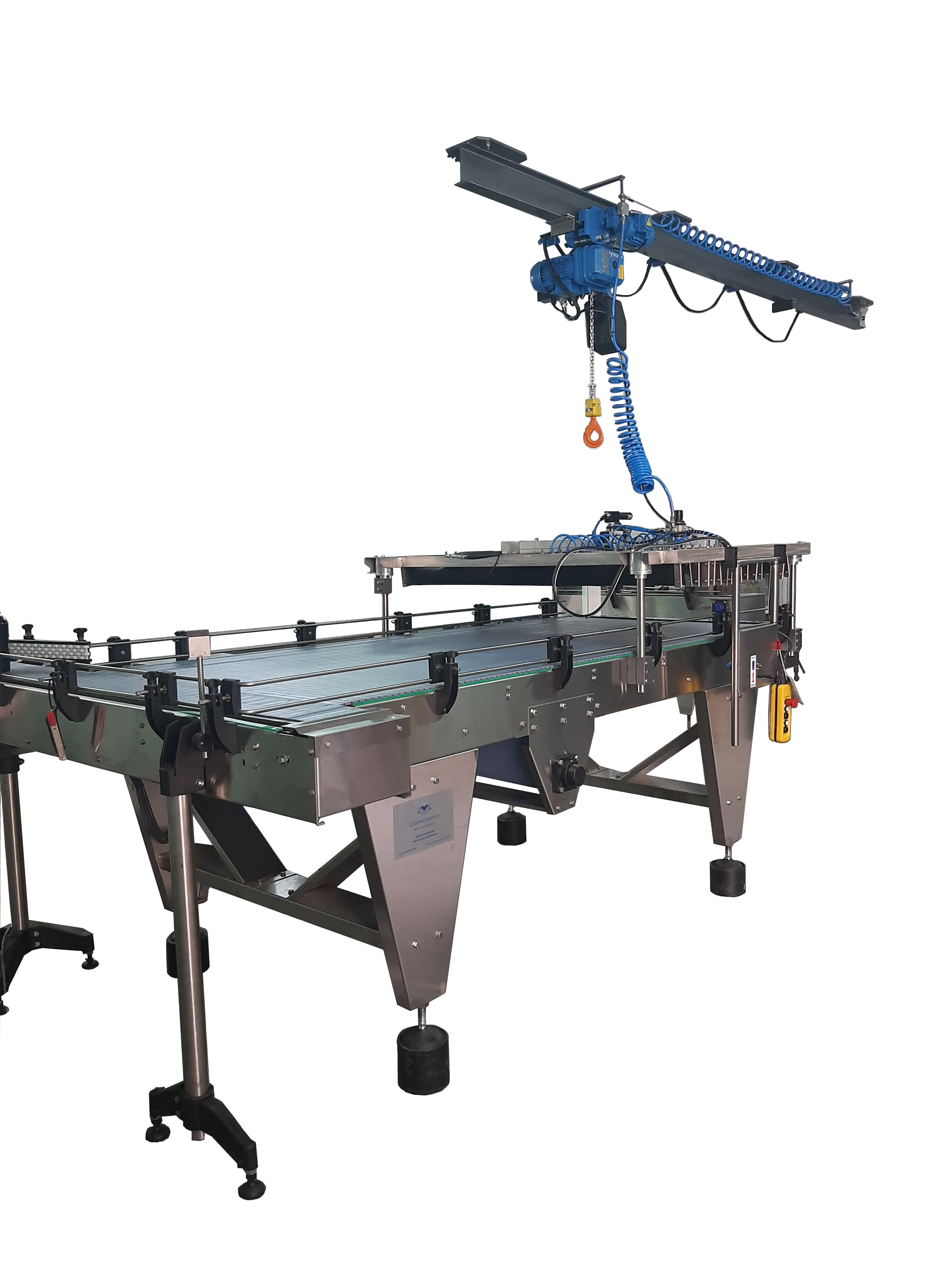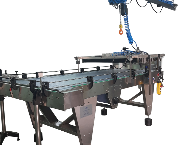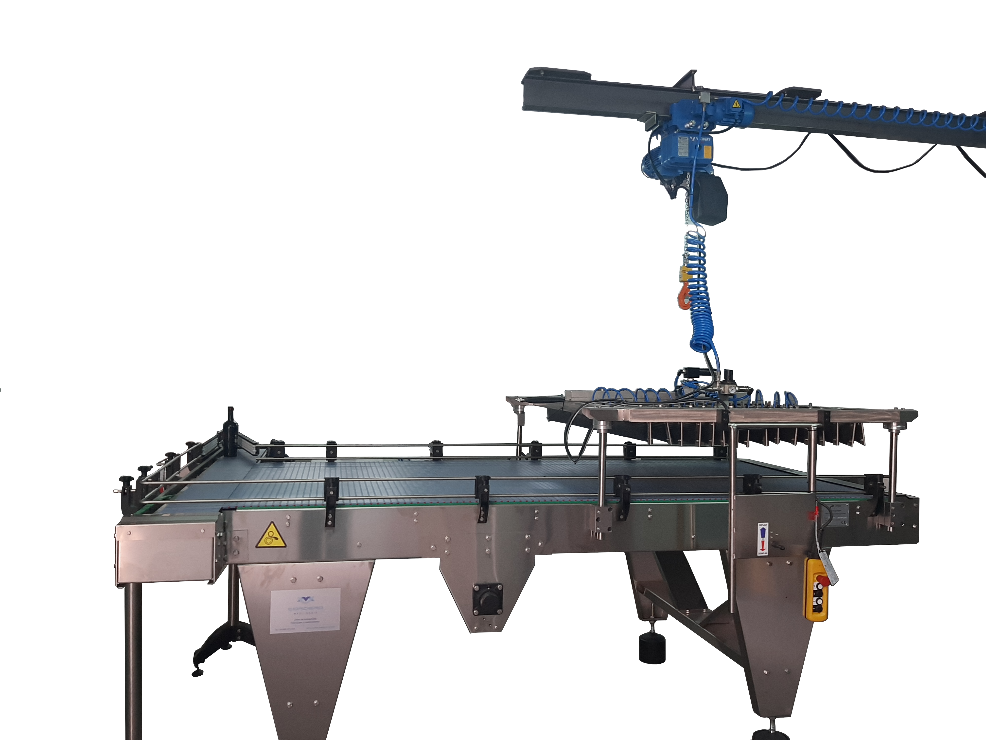 Conjunto de pluma, polipasto y mesa para la carga o descarga de botellas en jaulón. Sistema neumático por tulipas por cuartos de jaulón. Construcción del chasis y apoyos en acero inoxidable.