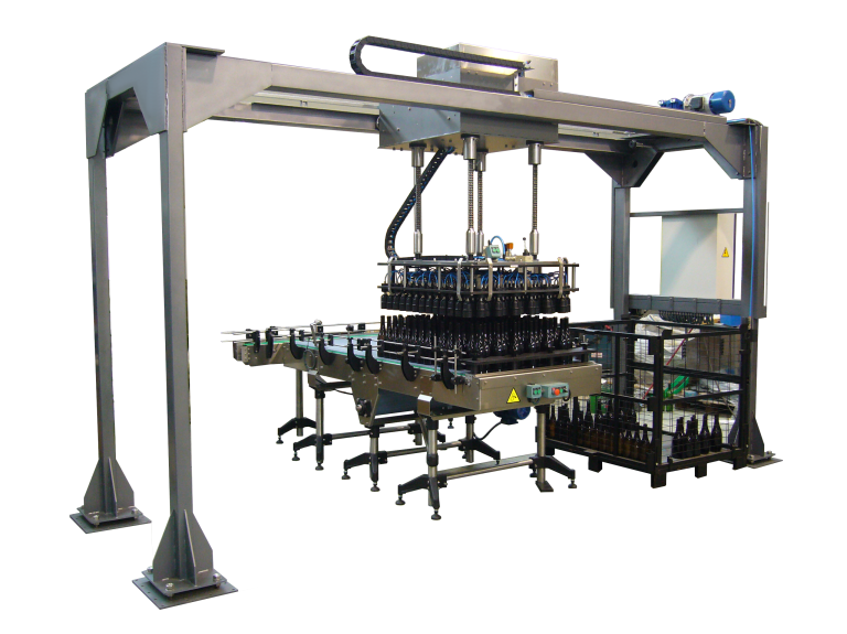 Producción 1.500 - 6.000 botellas/hora. Chasis, apoyos y pórtico en acero inoxidable. Distintas configuraciones de salida como de carga de botellas. Salida perpendicular y en línea. Carga trasera y lateral.